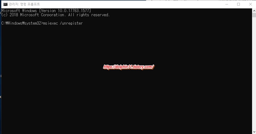 명령어 msiexec /unregister 를 입력하여 기존 설치된 windows installer 를 삭제한다.