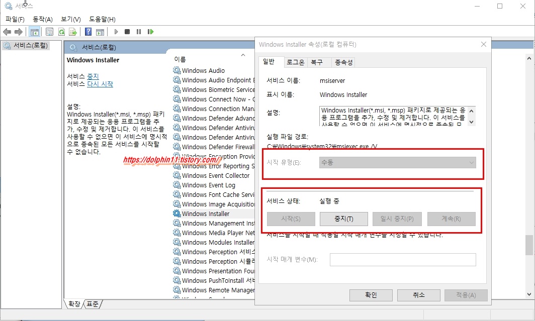 2. 시작 -실행 을 띄어 services.msc항목에 들어가 windows installer항목을 더블클릭하여 서비스상태와 시작유형이 중지가 되었거나 사용안함으로 되어있는지 확인한다. 만약 이렇게 되어있다면 자동 시작 , 서비스상태는 시작으로 바꿔줘야한다. 그리고 재부팅을 해주고 다시 설치