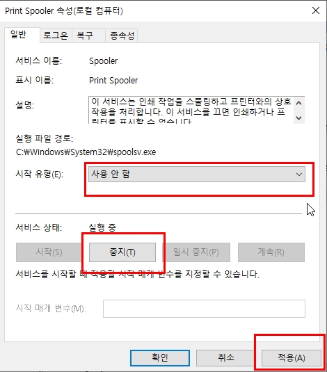 Print Spooler 속성 을 들어가서 시작유형은 사용안함 서비스상태는 중지버튼을 클릭하고 적용 버튼을 눌러줍니다.
