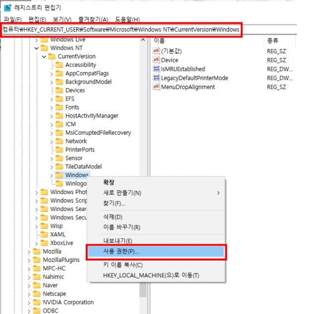 windows --> 오른쪽 마우스 클릭하여 " 사용 권한" 클릭합니다.