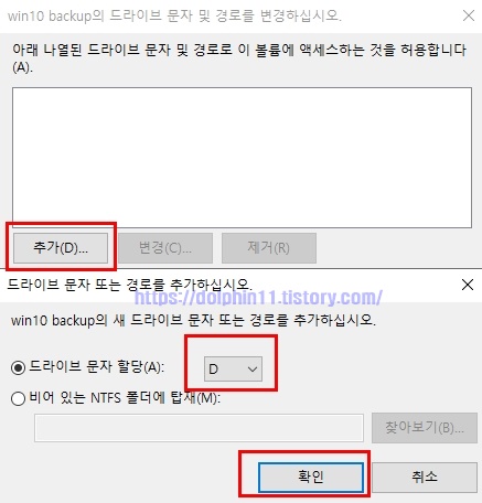 드라이브 문자 할당 을 D로 바꿔준후 확인 버튼을 눌러줍니다.