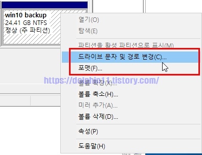 경로가 지정 되어 있지 않은 드라이브 의 우버튼 클릭 하여 드라이브 문자 및 경로 변경(C).... 을 클릭하여 들어가줍니다.