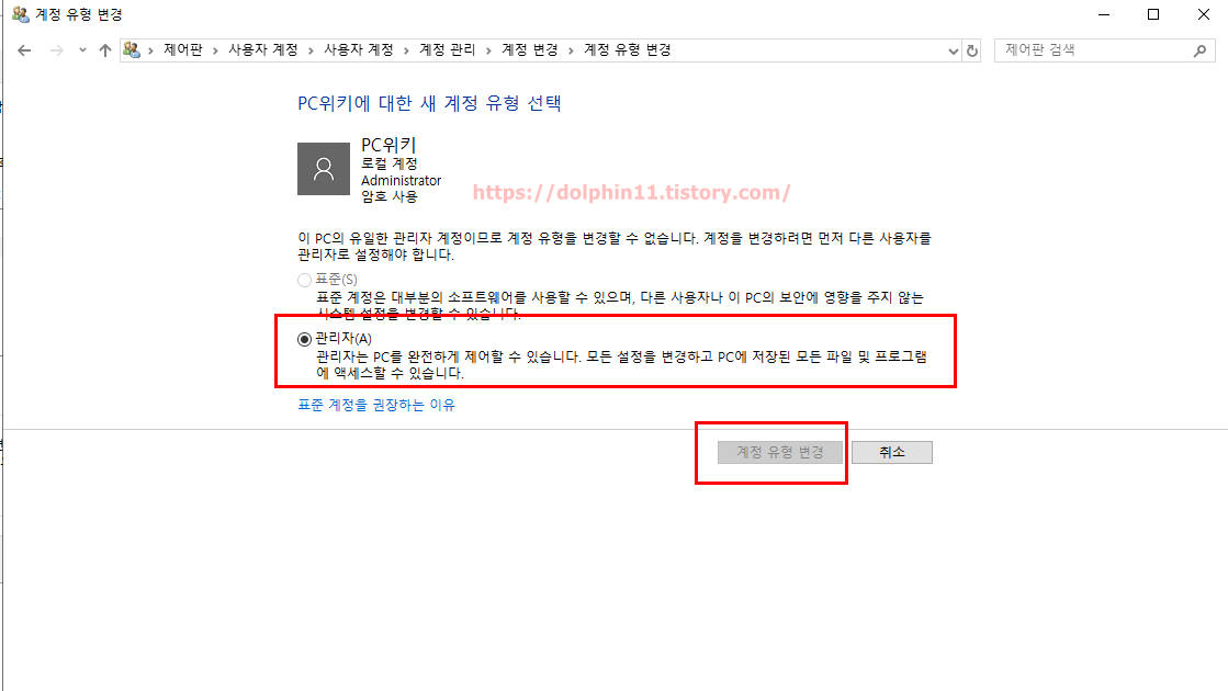 표준이 되어있는 일반 사용자를 관리자(A) 에 체크 해주신 후, 계정 유형 변경 버튼을 눌러주게 되면,
