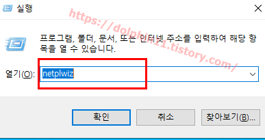 netplwiz 를 입력하고 확인 버튼을 눌러줍니다.