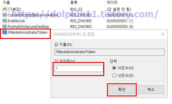 FilterAdministratorToKen의 값을 1로 주고, 재부팅 하면 됩니다.