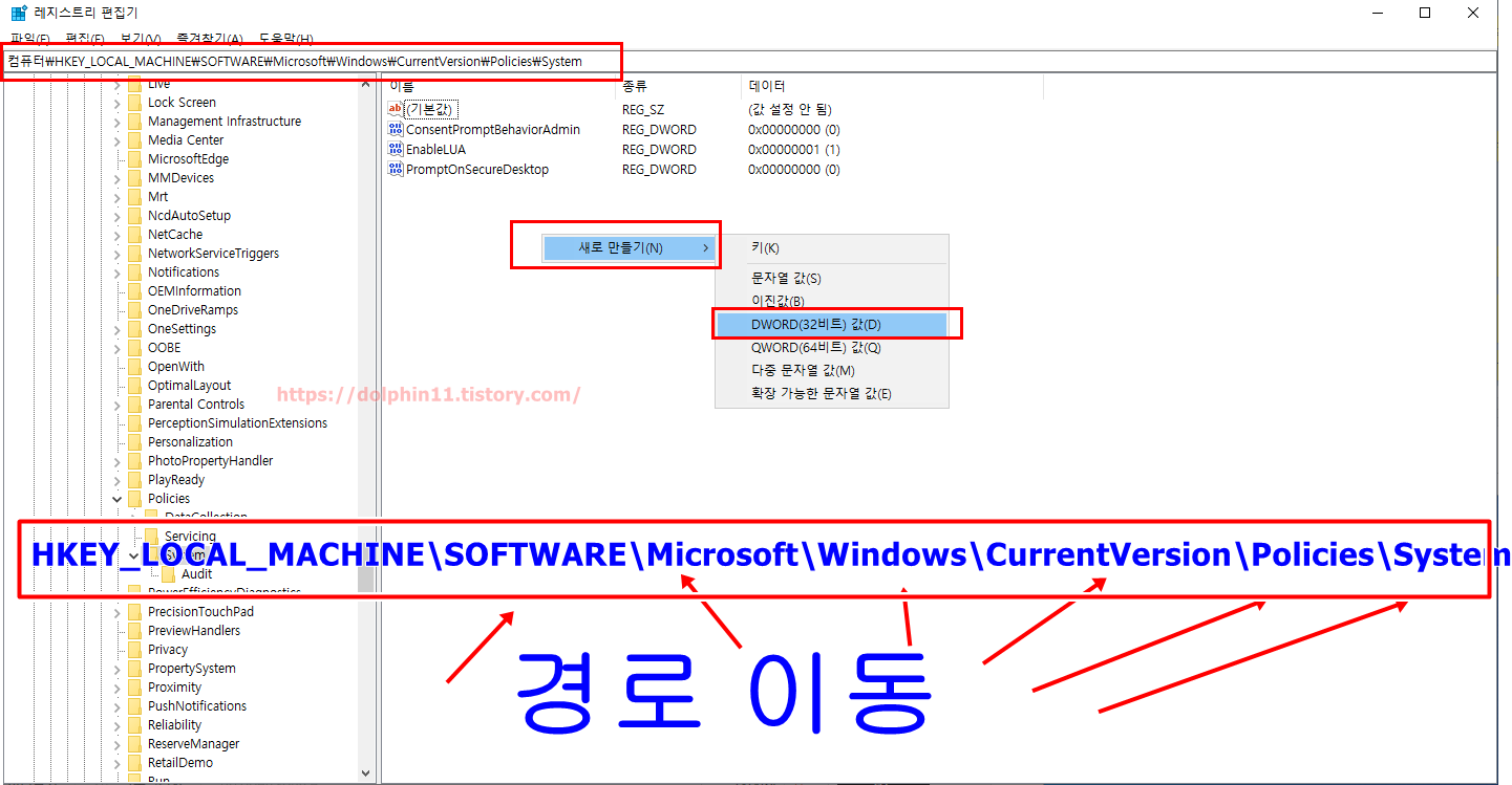 빈여백 - 우클릭 버튼 - 새로 만들기(N) - DWORD(32비트)값(D) 를 눌러 생성 해 줍니다.