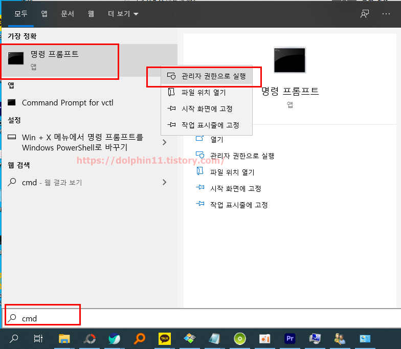 검색 아이콘을 클릭하여 cmd(명령프롬포트)를 우클릭-관리자 권한으로 실행 해줍니다.
