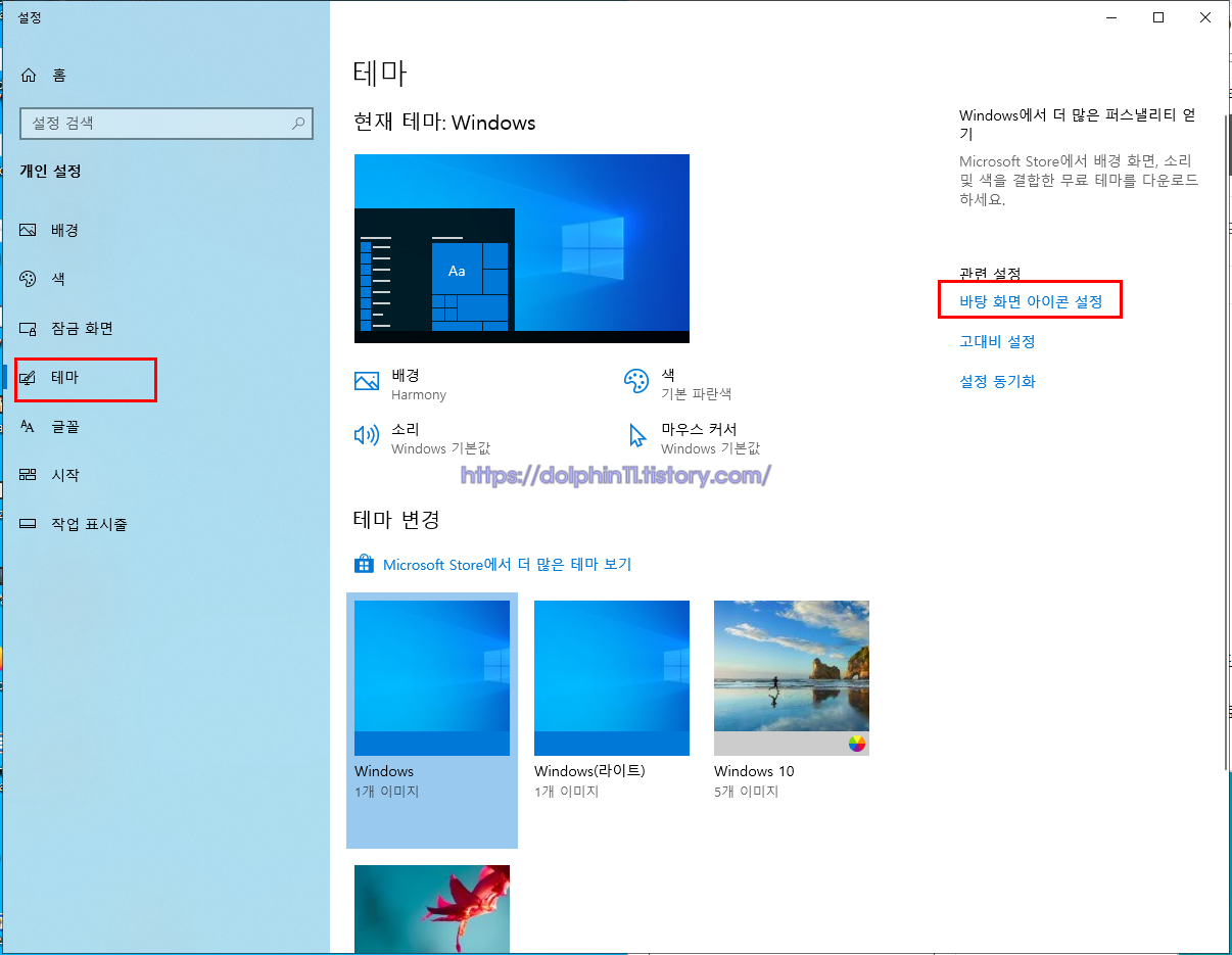 왼쪽 항목중에 테마로 이동하면 바로 오른쪽 항목에 바탕화면 아이콘 설정이라고 있습니다.