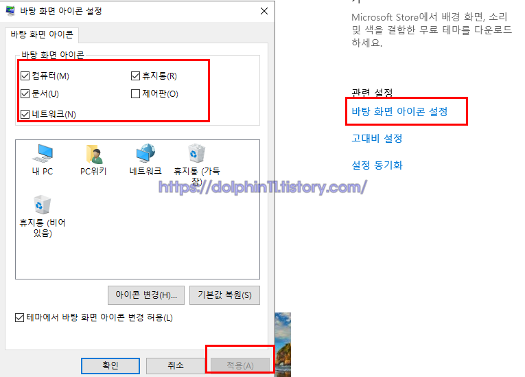 바탕화면 아이콘에 생성 할 항목들을 선택해준 뒤 적용 버튼을 눌러주면 끝납니다.