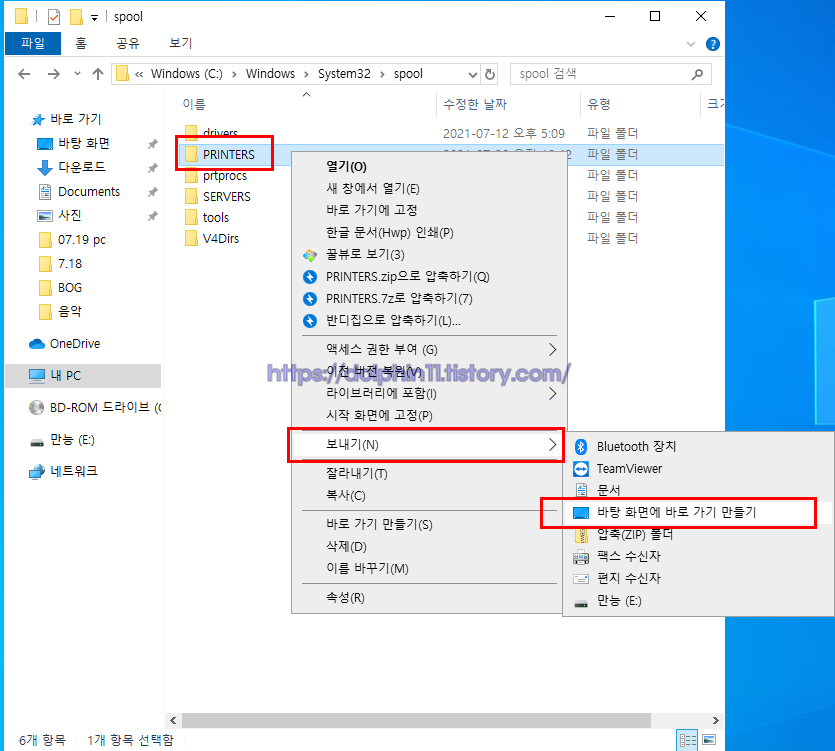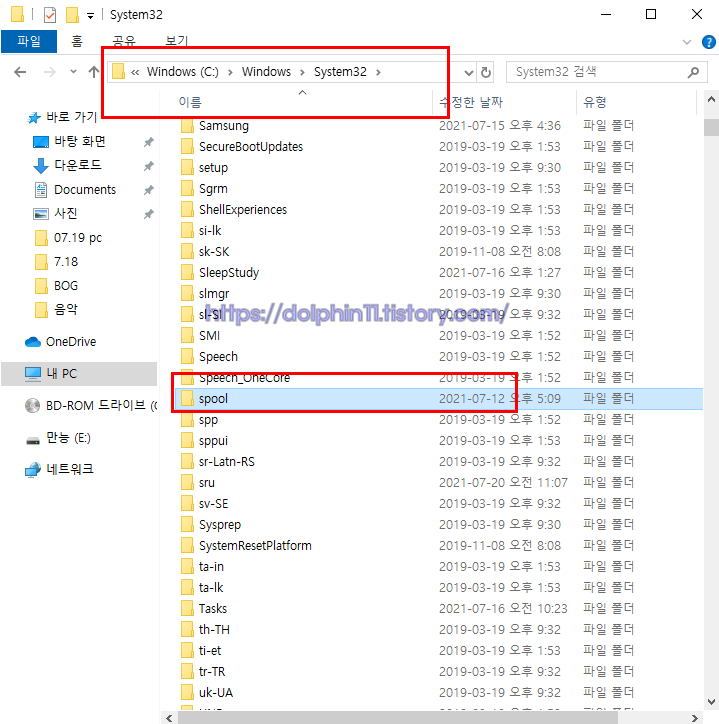 이제 C:\Windows\System32\spool\PRINTERS 폴더의 경로를 찾아 들어가줍니다.