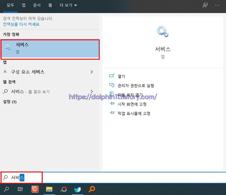 Win키 + R 키를 눌러 실행창을 띄운다음, 서비스라고 입력해서 들어갑니다.