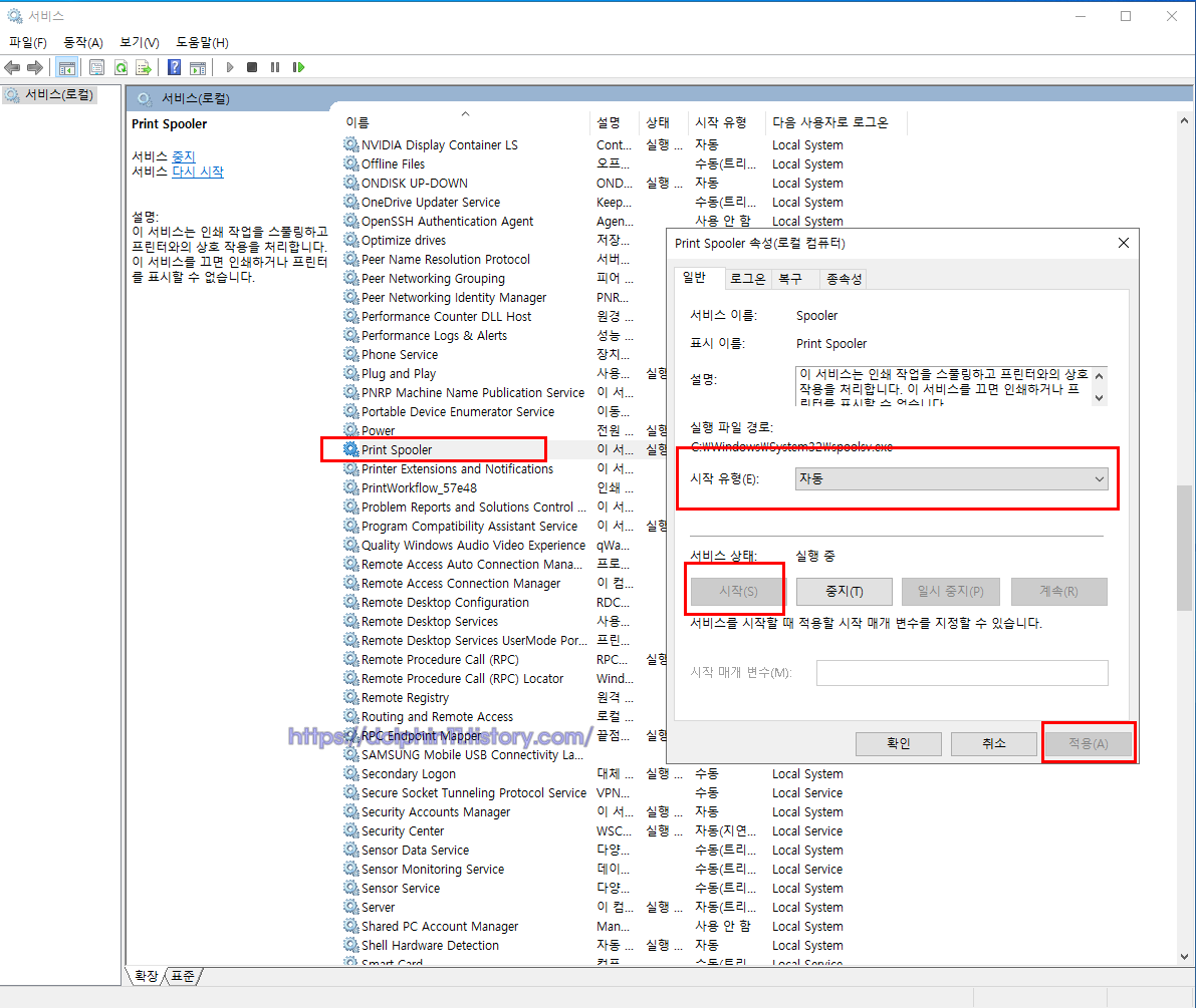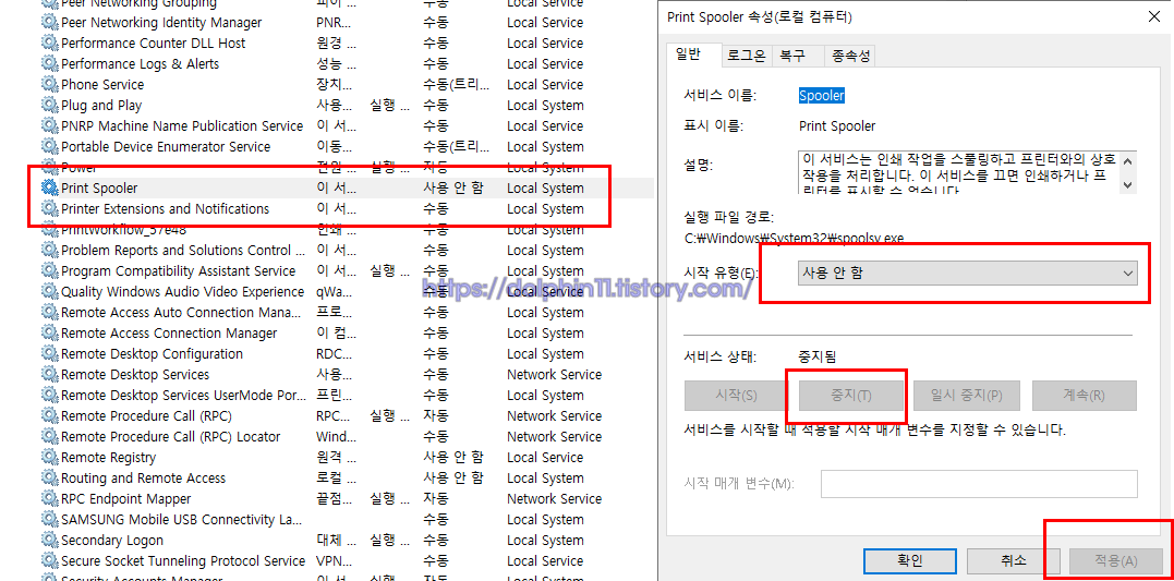 서비스 항목들 중에 Print Spooler를 더블클릭하여 속성에 진입합니다.