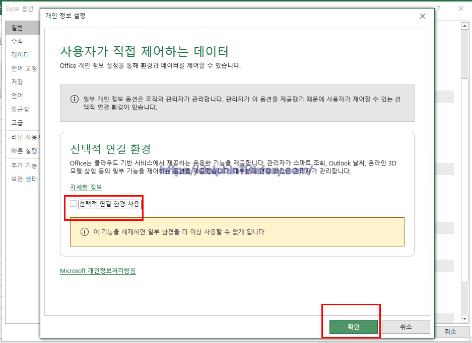 선택적 연결 환경 사용을 체크 해제 한후 확인 버튼을 눌러줍니다.