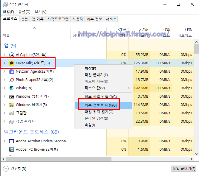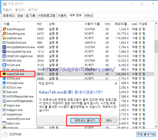 해당항목으로 자동 클릭이 될 텐데요 작업 끝내기를 눌러서 프로세스 끝내기를 해주면 됩니다.