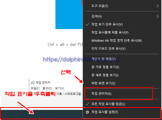 작업 표시줄 에 우측 버튼 클릭- 작업관리자로 들어가줍니다.