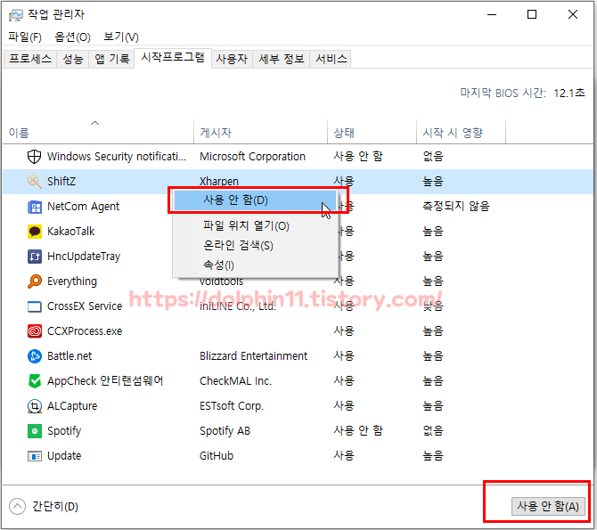 보여지는 시작 프로그램 들 중에 내가 사용하지 않는 불필요한 프로그램들을 우클릭 사용안함 버튼을 클릭해주세요.