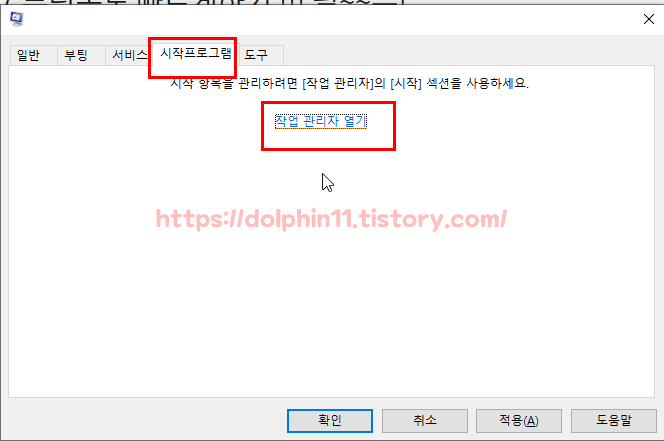 다음은 시작프로그램 항목의 작업 관리자 열기를 눌러줍니다.
