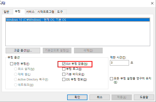 부팅옵션의 GUI 부팅 없음을 체크 해주세요.
