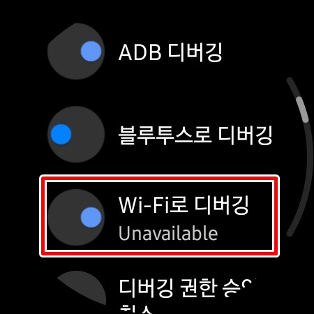 7. Wi-Fi로 디버깅을 체크해주면 블루투스로 디버깅은 자동으로 해제가 됩니다.