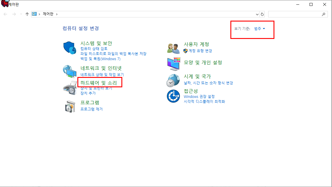 하드웨어 및 소리 - 마우스 항목을 클릭하여 들어갑니다.