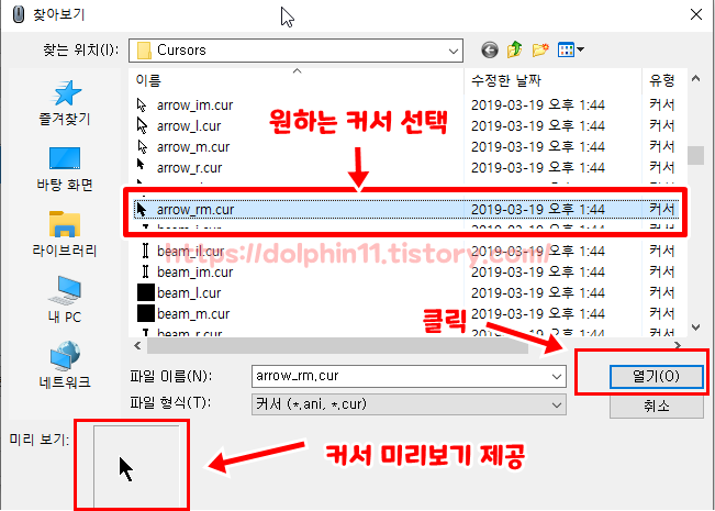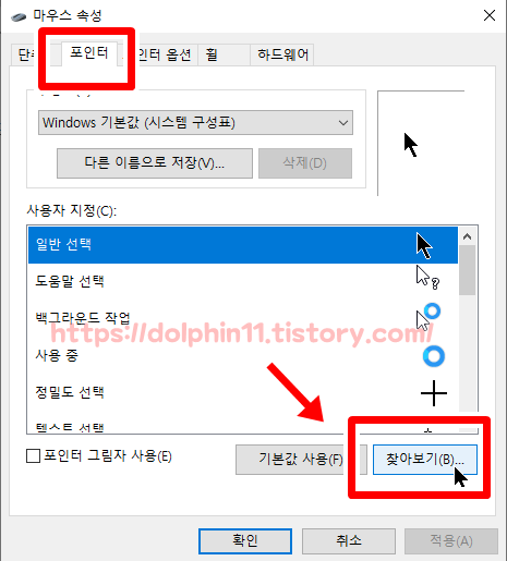 찾아보기 창에서 원하시는 커서를 선택을 하면 미리보기로 적용 모습을 미리 볼 수있습니다.