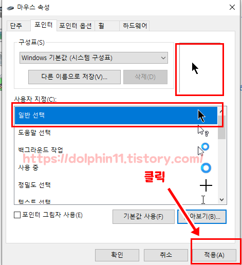 이렇게 선택된 마우스 커서를 적용 버튼을 눌러줍니다.