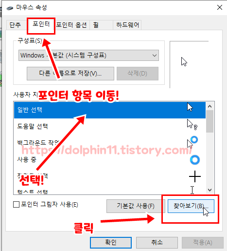 윈도우 자체적으로 마우스 포인터를 변경 하는 방법!