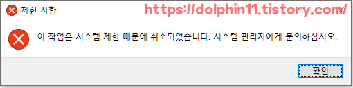 제한 사항 이 작업은 시스템 제한 때문에 취소되었습니다. 시스템 관리자에게 문의하십시오. 라는 창이 뜨면서