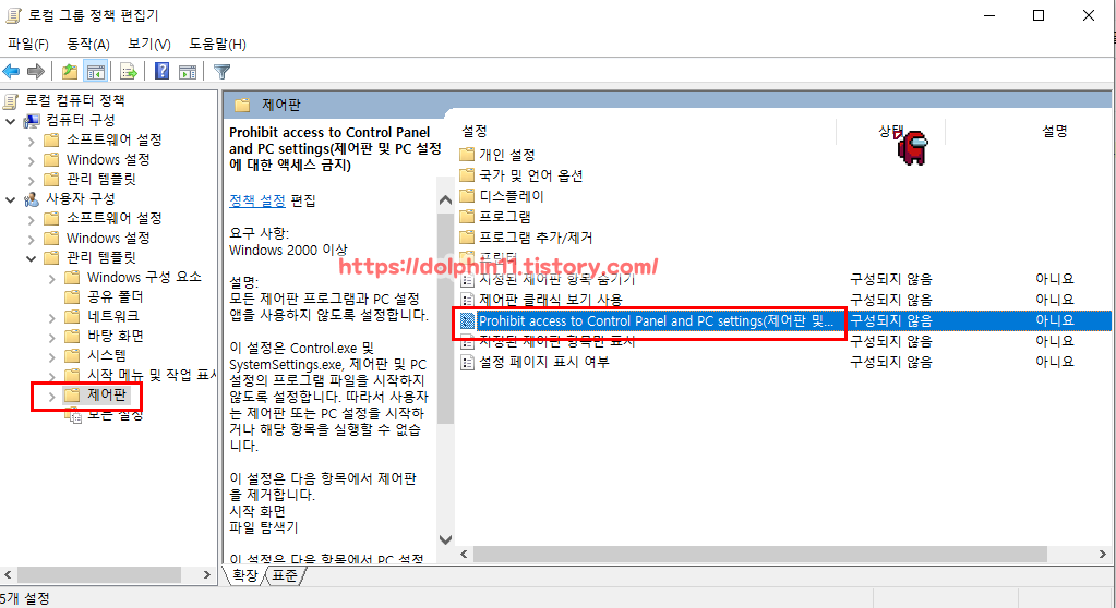 로컬그룹 정책 편집기로 제어판(windows 설정) 접근 금지 하는 법
