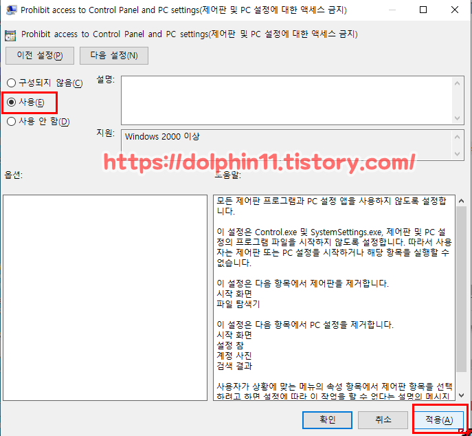 Prohibit access to control Panel and PC settings(제어판 및 PC설정에 대한 액세스 금지) 속성창이 열리면