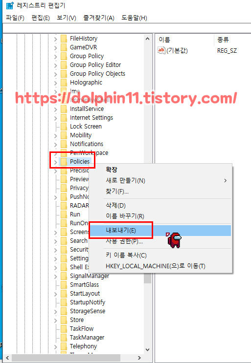 위치 경로로 이동하여 Policies 를 마우스 우측버튼 클릭 하여 내보내기버튼을 클릭합니다.
