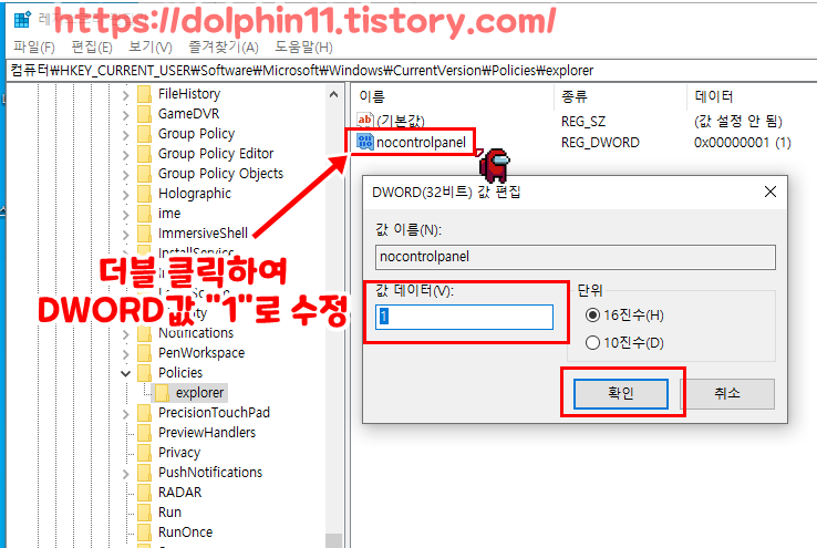 생성된 nocontrolpanel 을 클릭하여 값 데이터를 1로 입력 하고 확인 버튼을 눌러 마무리 합니다.