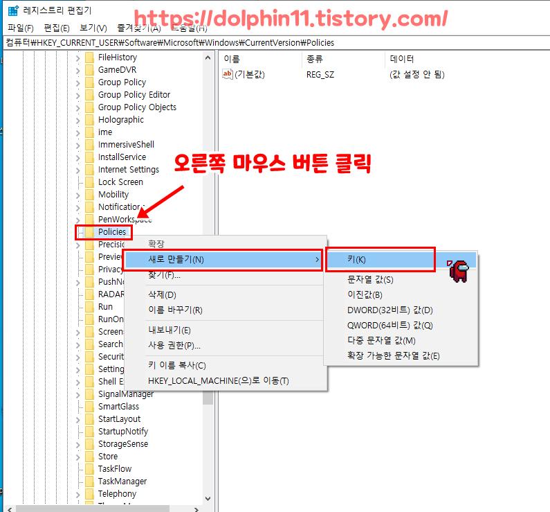 Policies 폴더에 우측 마우스버튼 클릭 - 새로 만들기 - 키 를 클릭하여 생성 합니다.