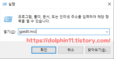 이후 gpedit.msc 를 입력하고 확인 버튼을 눌러 '로컬 그룹 정책 편집기'를 열어 줍니다.
