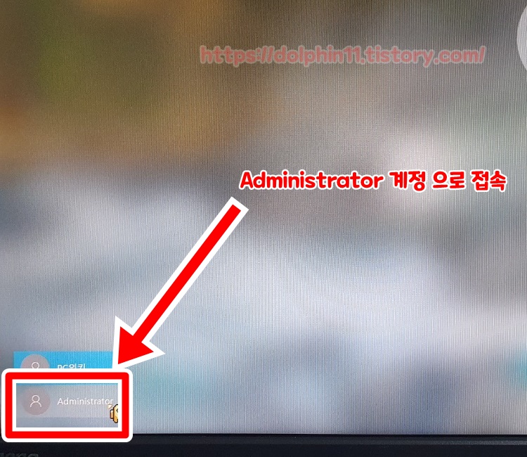 우측 하단에 로그인 하기전 계정을 선택하는 란이 나옵니다. 저 같은 경우 PC위키 Administrator 두개의 계정이 있습니다. 최고 관리자 계정인 Administrator 를 클릭하여 로그인 해줍니다.