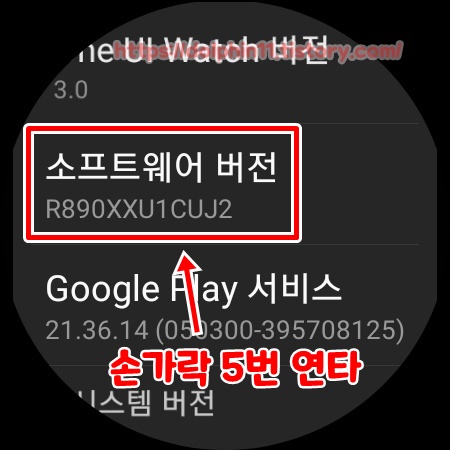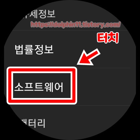 우리의 자랑스러운 검지 손가락으로 위에서 아래로 스와이프 해줍니다. 그럼 화면에 보여지는 톱니바퀴 모양의 설정 항목을 터치 합니다. 맨아래로 스와이프 해주시면 워치 정보라는 항목이 있습니다. 여기를 들어 갑니다.