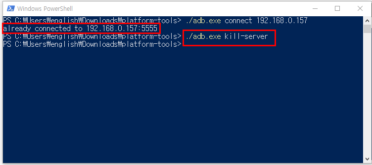 만약 작업하시다가 실수 하셔서 다시 /adb.exe connect 192.168.0.157 를 입력 하신다면 already connected to 192.168.0.157 이라 뜨면서 추후에 워치페이스 작동이 안될 수 있습니다. 이럴경우 여기서 /adb.exe kill-server 명령어를 입력하여 저장된 내역을 전부 삭제하고 다시 입력해주시면 됩니다. 위 명령어 파일 첨부 합니다.