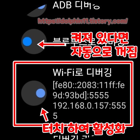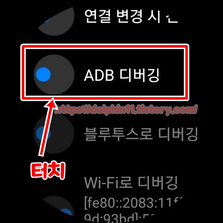 아래로 조금만 내려 주시다보면 ADB 디버깅이라는 항목이 있습니다. 터치를 하게되면 'ADB 디버깅 계속할까요?' 문구와 함께 V 누르는 표시가 나옵니다. 터치하여 활성화 해줍니다. Wi-Fi로 디버깅을 활성화 해주시면 블루투스로 디버깅의 항목은 저절로 비활성화가 됩니다. 그리고 다시 설정 초기 메뉴로 돌아옵니다.