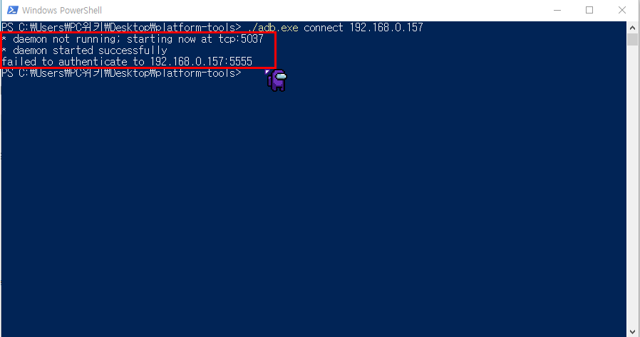 * daemon not running; starting now at tcp:5037 * daemon started successfully failed to authenticate to 192.168.0.157:5555 ※여기서 failed to authenticate 는 무시 해줘도 됩니다. connect to authenticate 나와도 상관 없습니다.~