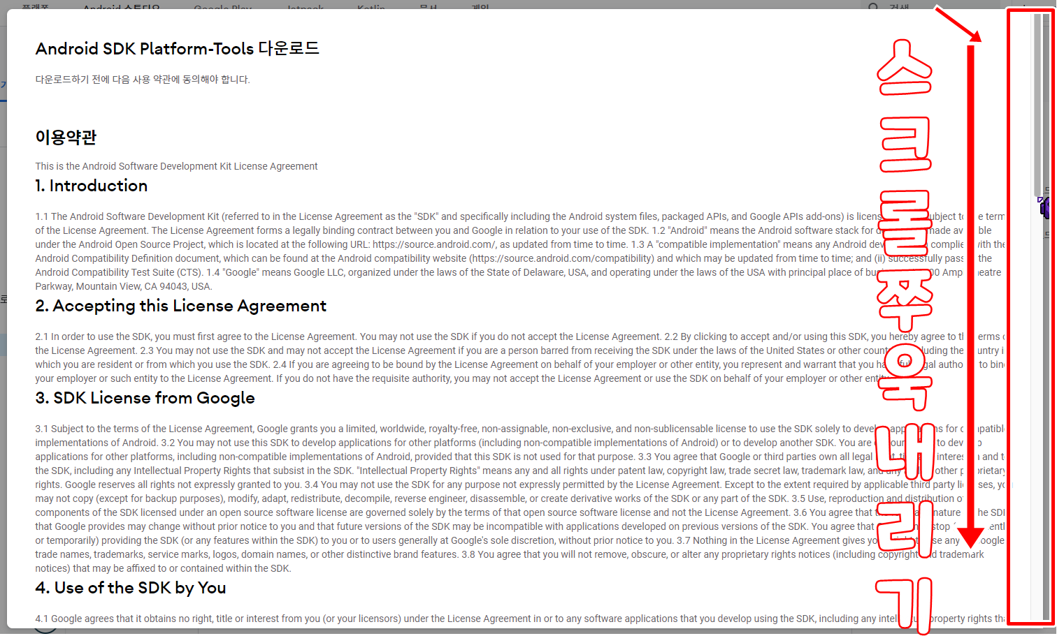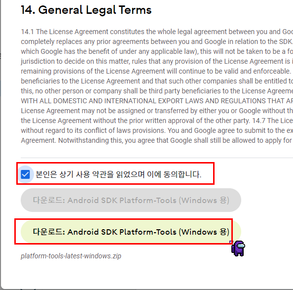 Windows용 SDK 플랫폼 도구 다운로드 를 누르면 이용약관/동의 하는 란이 나옵니다. 마우스 가운데 스크롤을 이용하거나 스크롤바를 꽉 잡고 쭈욱 내려줍니다. 그럼 '본인은 상기 사용 약관을 읽었으며 이에 동의합니다.' 를 체크 해주고 다운로드: Android SDK Platform-Tools(Windows 용) 을 클릭하여 다운로드 해줍니다. (바탕화면에 저장 해주시는것이 좋을 것 같아요~ 편한대로 해주시면 됩니다.)