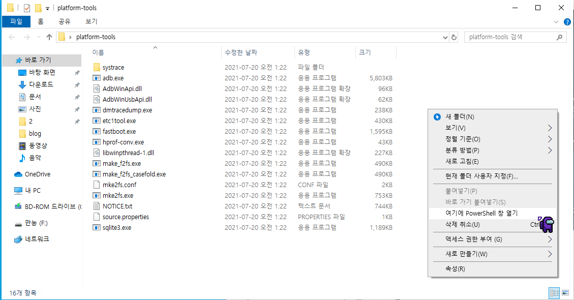 그럼 platform-tools_r31.0.3-windows.zip 파일로 저장이 되게 됩니다.(압축파일) 그럼 왼쪽 사진 처럼 압축을 풀어 줍니다. 오른쪽 사진처럼 압축을 풀은 폴더 platform-tools로 파일을 열어 주고 ※ 빈 공란에 키보드의 Shift 키를 누른 상태로 마우스 우측버튼을 클릭하여 여기에 PowerShell창 열기 를 클릭하여 Windows PowerShell 을 열어 줍니다. 꼭 이렇게 해야만 합니다.