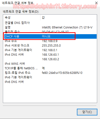그리고 다시 '자세히'항목을 보면 DHCP사용이 아니요(수동으로설정됨)을 확인 할 수 있습니다.