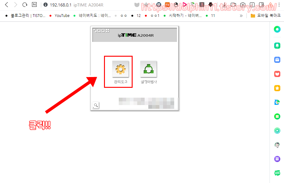 인터넷 주소창에 192.168.0.1 (iptime 기본 게이트웨이 주소 입력)을 입력하고 공유기 관리 사이트로 접속합니다.