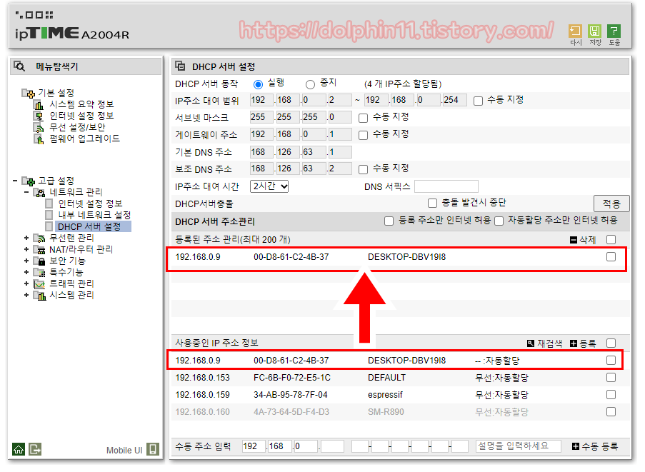 ipTIME 공유기로 내부(사설) IP 고정하기