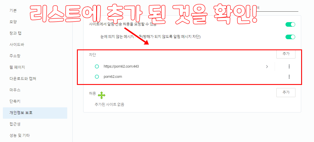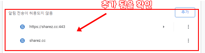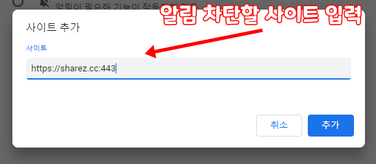 추가버튼을 클릭하여 알림을 차단할 주소를 입력 해주고 다음과 같이 추가 해주면 됩니다.