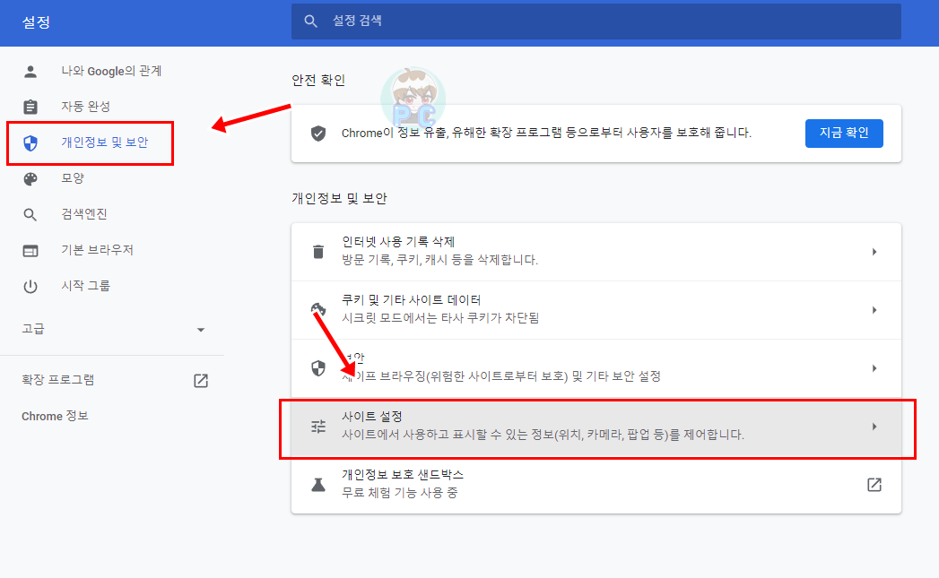 왼쪽 항목 중에 개인정보 및 보안 을 들어가서 사이트 설정을 클릭합니다.