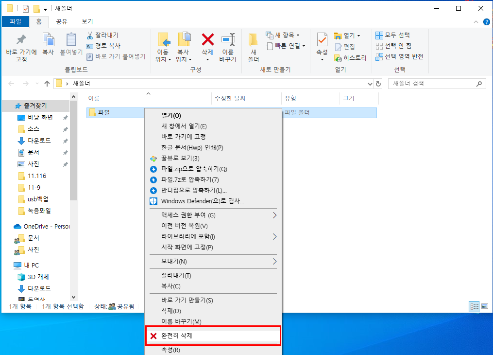 화면에 보이시는 바와 같이 마우스 우측버튼을 클릭하면 '완전히 삭제' 라는 메뉴가 생성 된 것을 확인 할 수 있습니다.