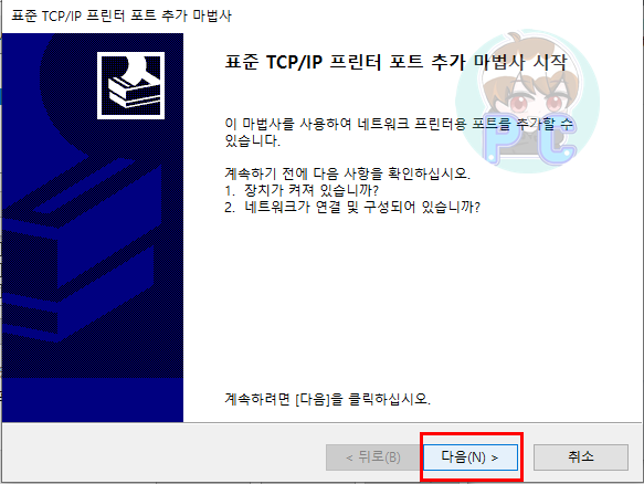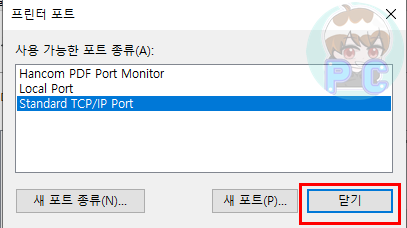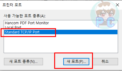 프린터 포트창이 열릴 것인데요. 여기서 Standard TCP/IP Port 를 클릭한 후 새포트버튼을 클릭합니다. 표준 TCP/IP 프린터 포트 추가 마법사가 열립니다. 다음 항목을 클릭합니다.