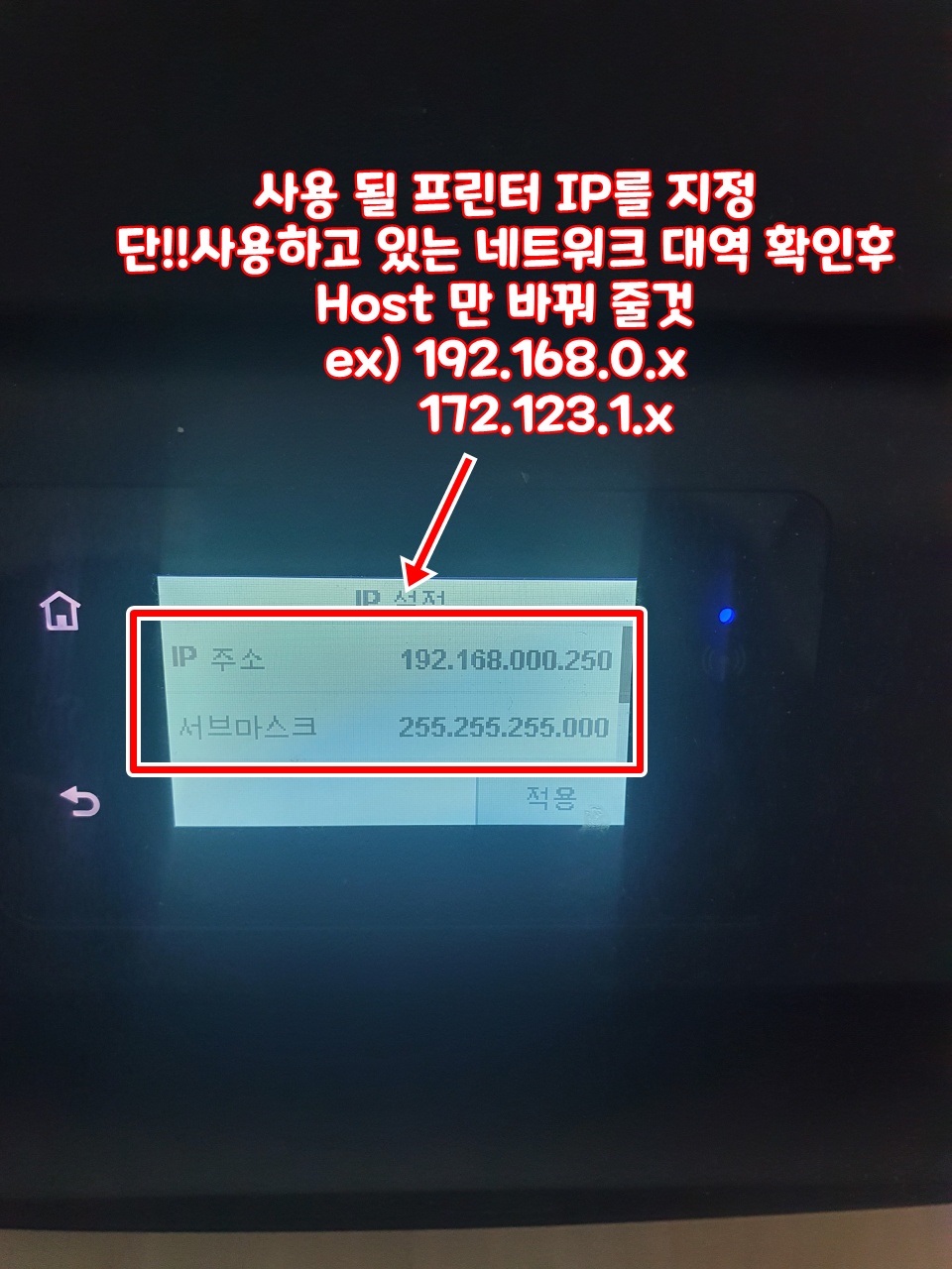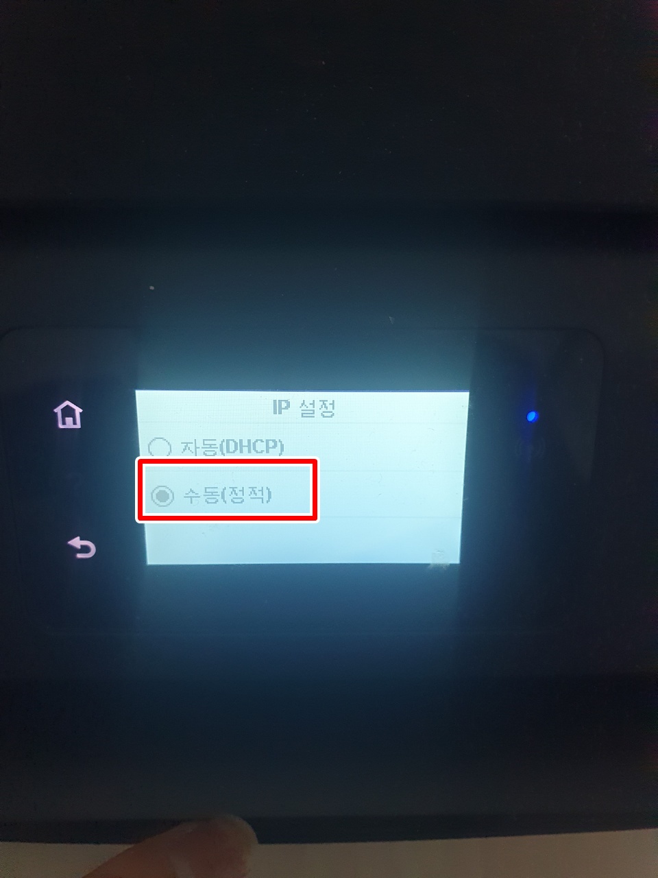 7. 수동(정적) 을 눌러 줍니다. 8. IP 주소/서브넷마스크/게이트웨이를 기입 합니다. IP 주소 같은 경우 iptime을 쓰신다면 192.168.0.x 대역을 쓰고 계실 것입니다. 통신사들 같은 경우 PC에서 cmd - ipconfig 명령어를 확인하여 어떤 대역을 쓰고있는지 확인 후 1.1.1.X 대역을 바꿔주시면 됩니다. ↑ 2~254 중 사용하고 있는 단말기랑 겹치지 않게끔 빈공간의 IP를(host) 설정 해주세요. 이렇게 하면 프린터/복합기의 세팅은 끝입니다.