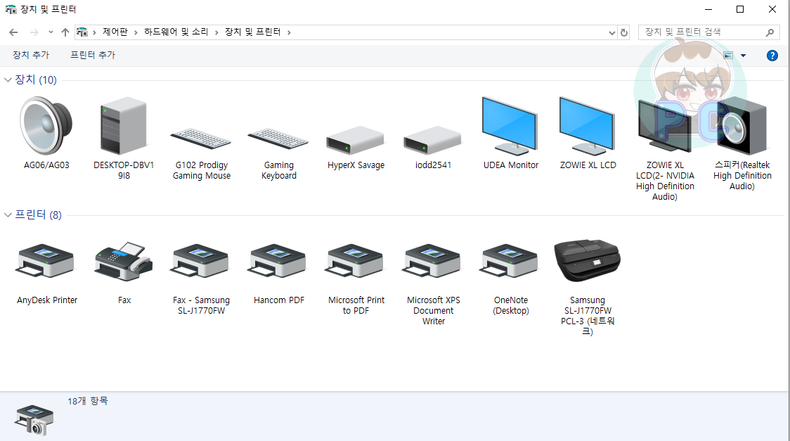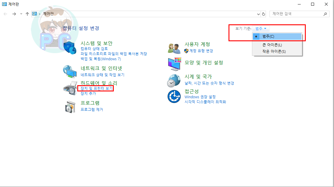 윈도우키 + S 키를 눌러 검색 창을 열어 줍니다. 제어판을 입력하여 들어 갑니다. 보기 기준을 범주로 바꿔 주신 후 장치 및 프린터 보기 를 클릭합니다.